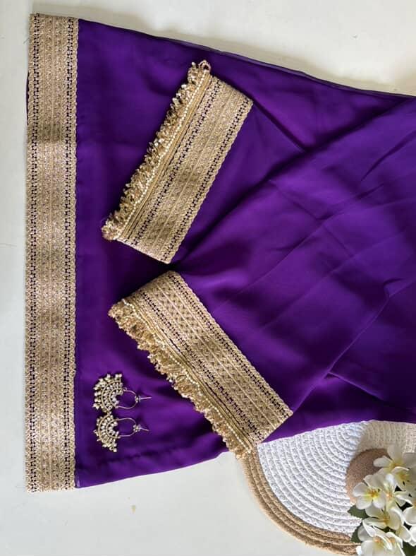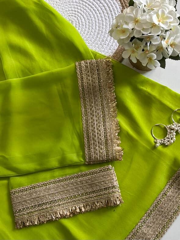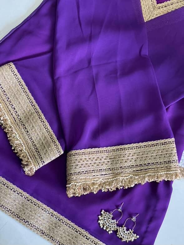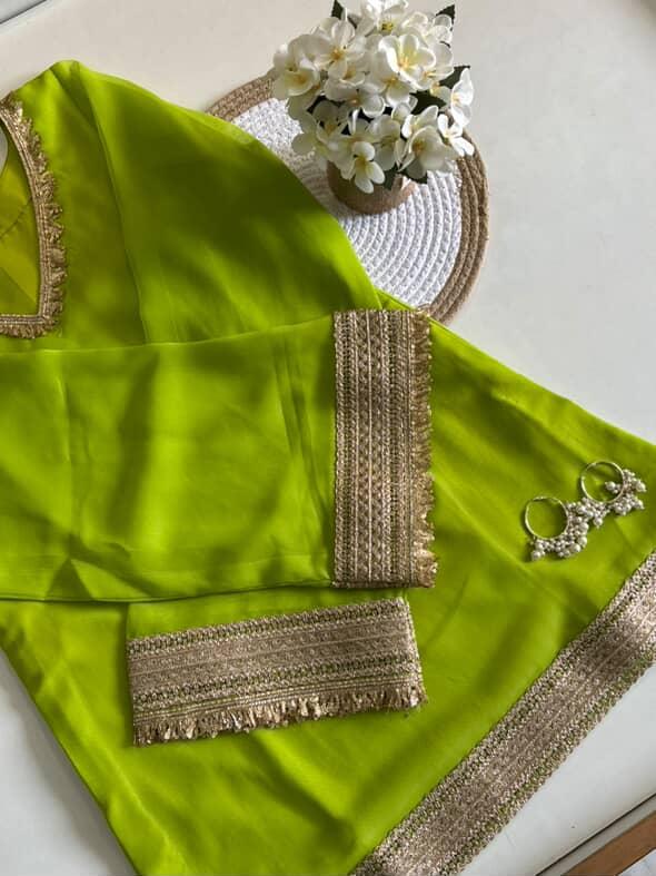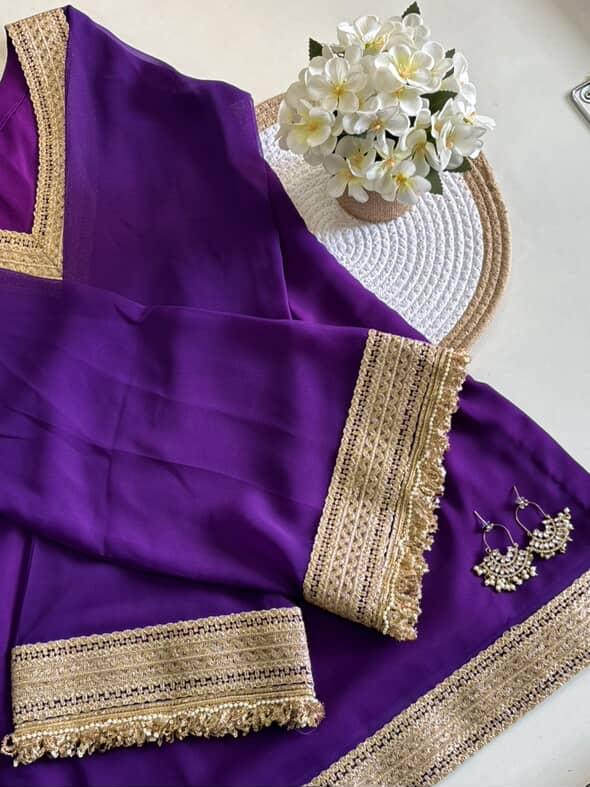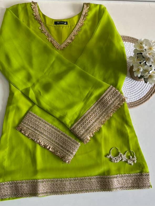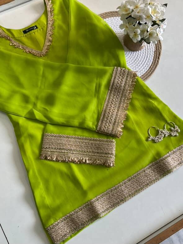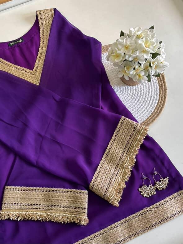 Brighten up your festive look with our new short kurties in purple and neon green. Made from soft georgette, these kurties are light, comfortable, and stylish. The traditional lace on the neckline and sleeves adds a beautiful festive touch, making them perfect for weddings, parties, and celebrations.