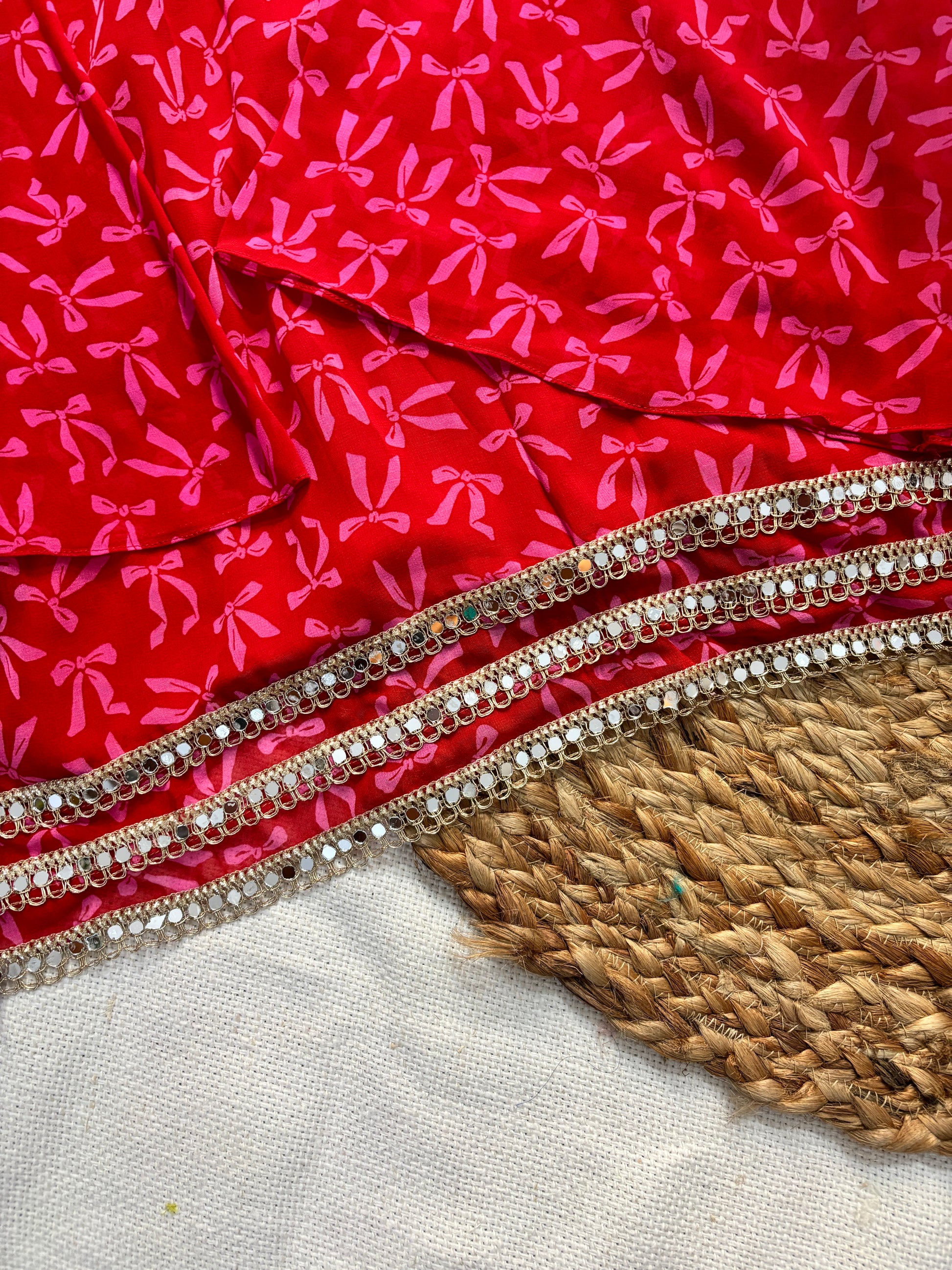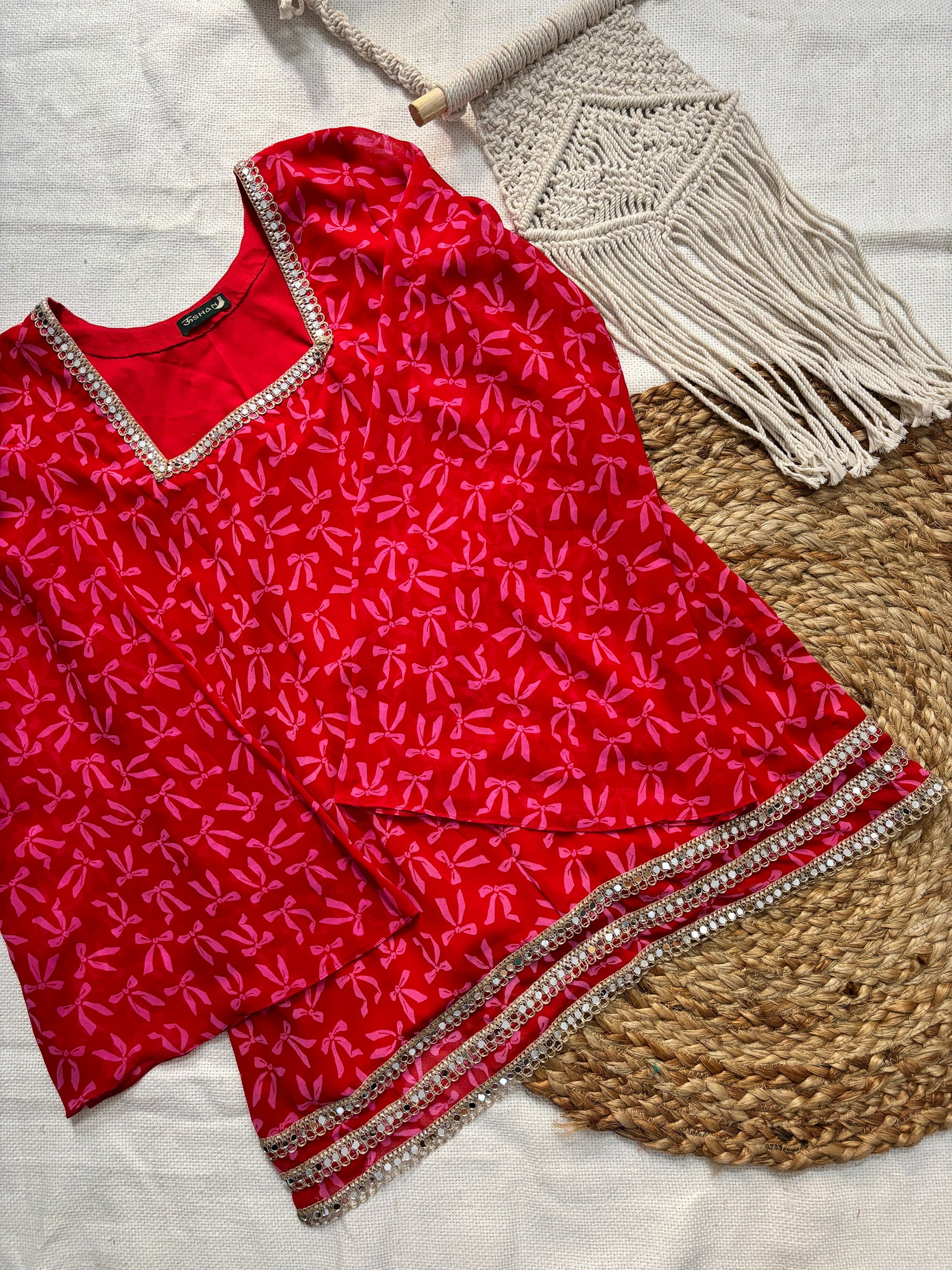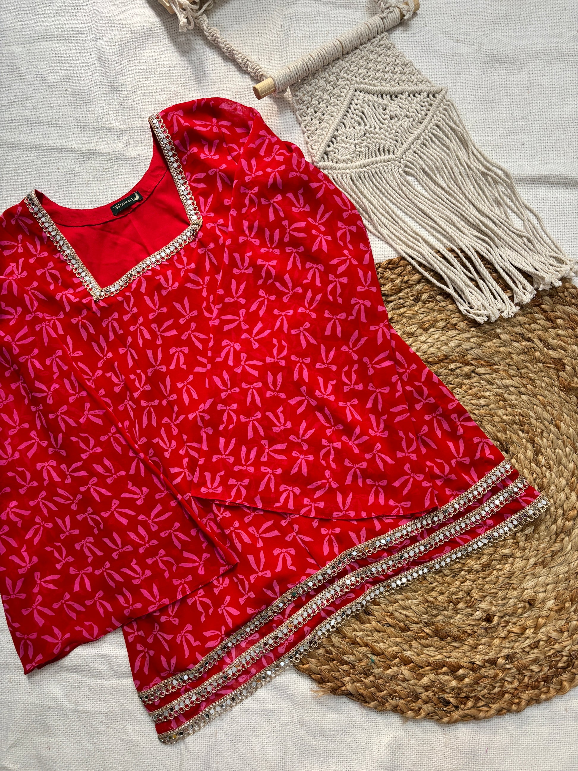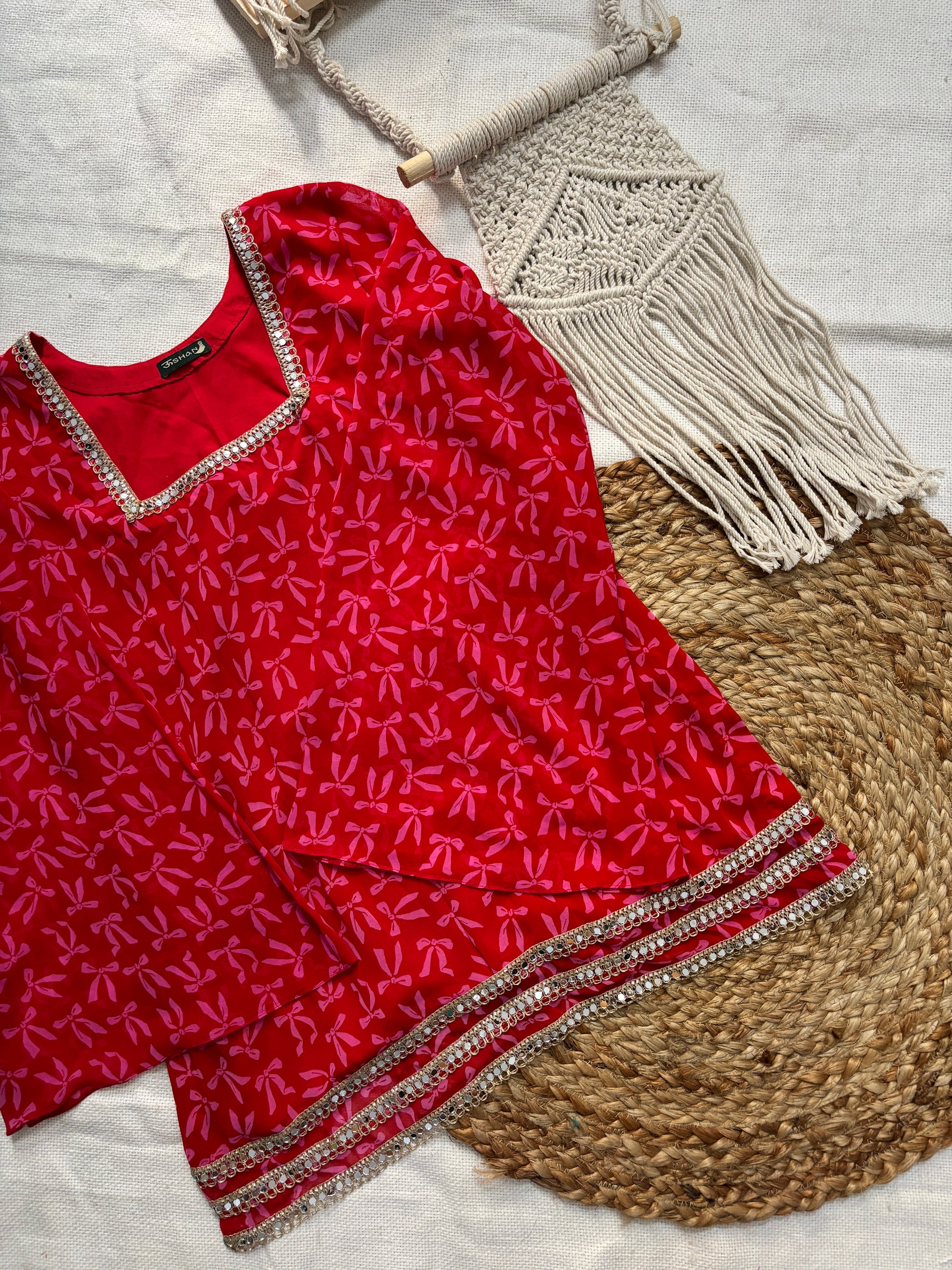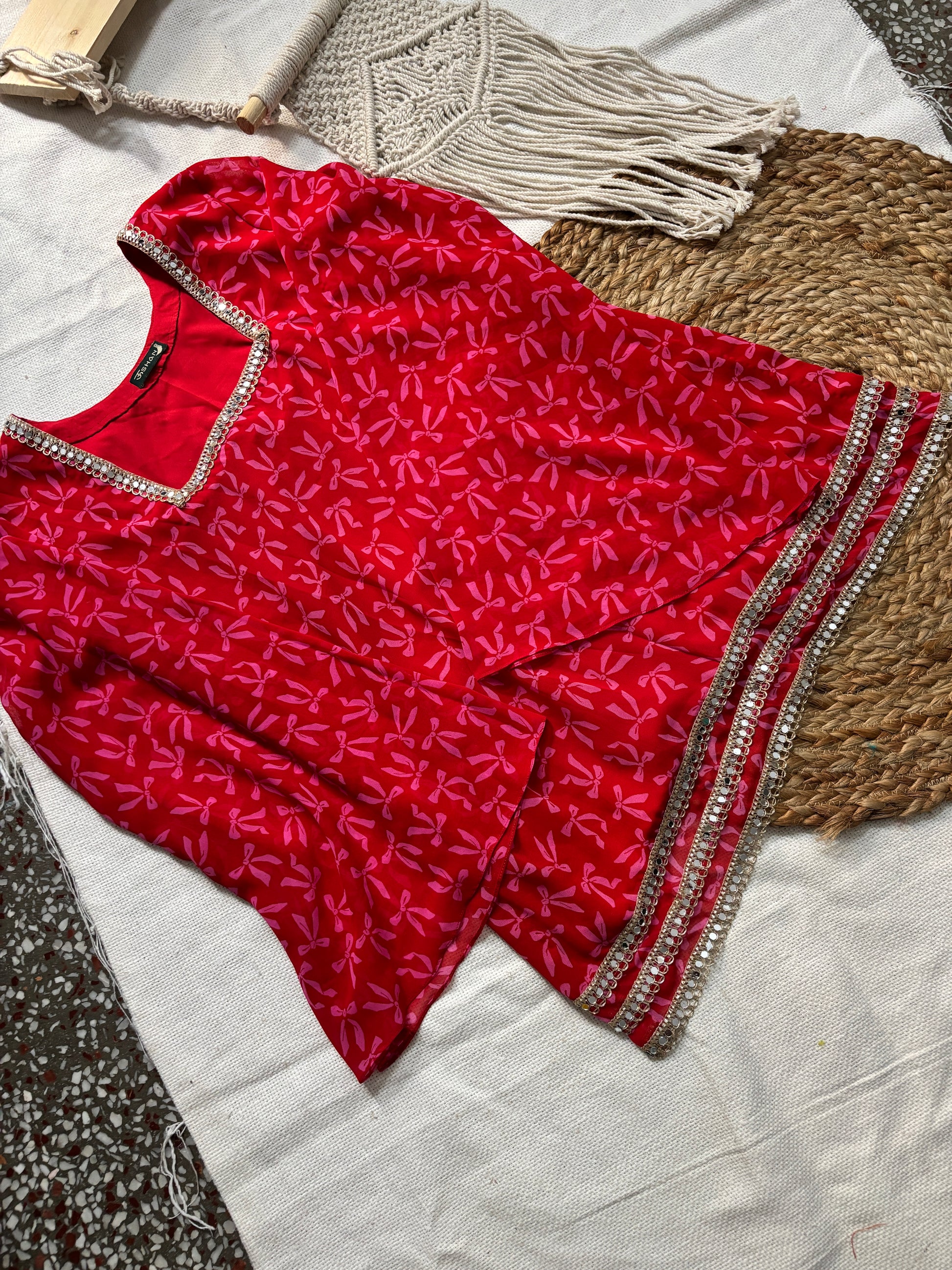 Add a pop of brightness to your wardrobe with Rose, a bold and beautiful short kurti in red colour with pink bow print. Crafted in lightweight Georgette fabric, Noor features a clean, modern silhouette elevated by its statement long bell sleeves adorned with intricate mirror lace.